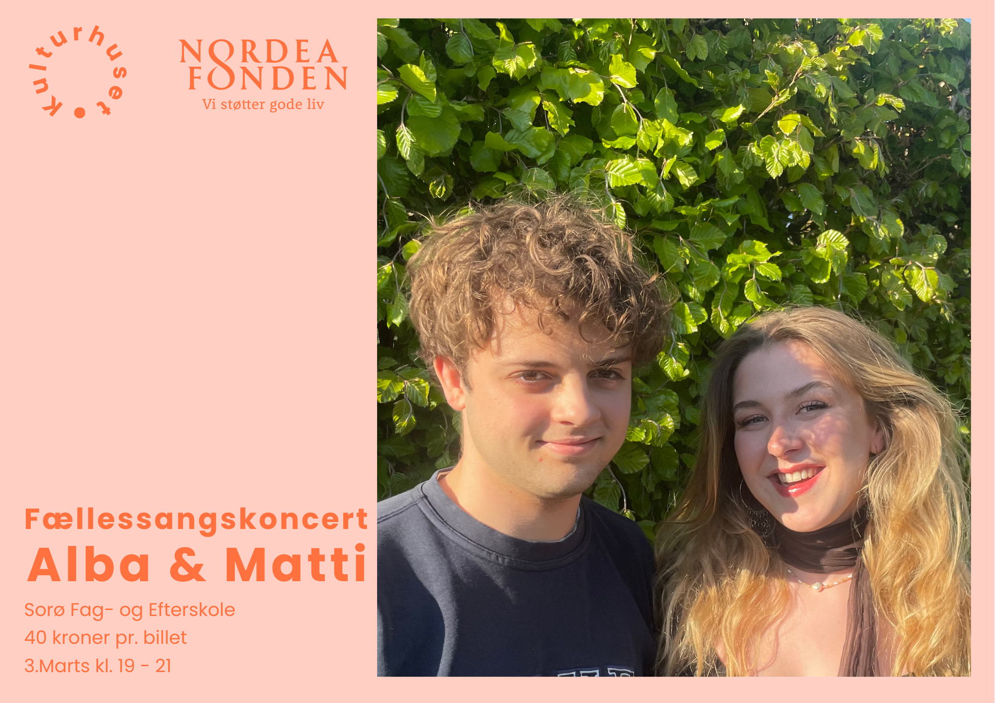 Aftenen byder på fællessang, musik og fortællinger i fællesskabets ånd, hvor vi sammen synger foråret ind i en traditionsrig og hyggelig ramme. Alba og Matti vil spille for os og give deres egne fortolkninger af klassiske sange – og selvfølgelig bliver der rig mulighed for selv at synge med.